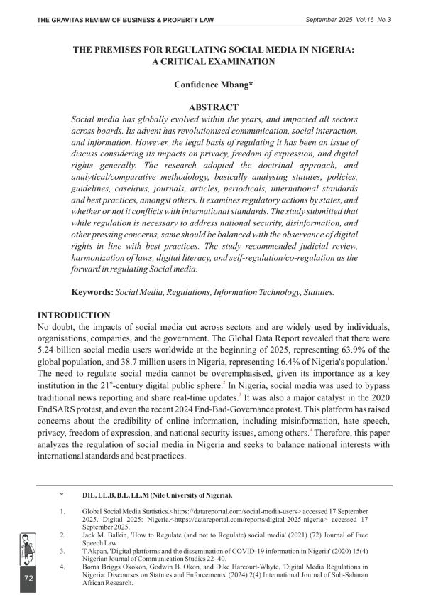 No doubt, the impacts of social media cut across sectors and are widely used by individuals, organisations, companies, and the government. The Global Data Report revealed that there were 5.24 billion social media users worldwide at the beginning of 2025, representing 63.9% of the global population, and 38.7 million users in Nigeria, representing 16.4% of Nigeria’s population.1 The need to regulate social media cannot be overemphasised, given its importance as a key institution in the 21-century digital public sphere.2 In Nigeria, social media was used to bypass traditional news reporting and share real-time updates.3 It was also a major catalyst in the 2020 EndSARS protest, and even the recent 2024 End-Bad-Governance protest. This platform has raised concerns about the credibility of online information, including misinformation, hate speech, privacy, freedom of expression, and national security issues, among others.4 Therefore, this paper analyzes the regulation of social media in Nigeria and seeks to balance national interests with international standards and best practices.