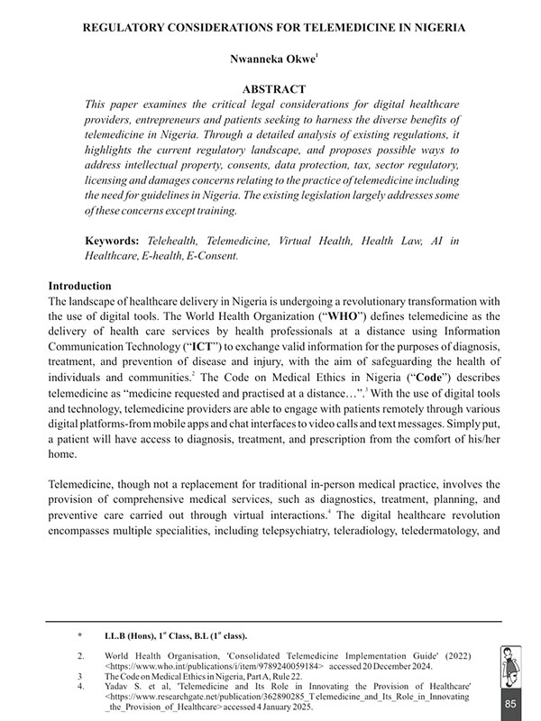 The landscape of healthcare delivery in Nigeria is undergoing a revolutionary transformation with the use of digital tools. The World Health Organization (“WHO”) defines telemedicine as the delivery of health care services by health professionals at a distance using Information Communication Technology (“ICT”) to exchange valid information for the purposes of diagnosis, treatment, and prevention of disease and injury, with the aim of safeguarding the health of individuals and communities.1 The Code on Medical Ethics in Nigeria (“Code”) describes telemedicine as “medicine requested and practised at a distance…”.2 With the use of digital tools and technology, telemedicine providers are able to engage with patients remotely through various digital platforms-from mobile apps and chat interfaces to video calls and text messages. Simply put, a patient will have access to diagnosis, treatment, and prescription from the comfort of his/her home.