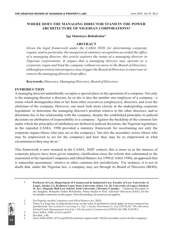 Given the legal framework under the CAMA 2020, for determining corporate organs, and in particular, the unequivocal statutory recognition accorded the office of a managing director, this article explores the status of a managing director in Nigerian corporations. It argues that a managing director may operate as a corporate organ and bind the company without recourse to the Board of Directors, although persistent intransigence may trigger the Board of Directors to intervene or remove the managing director from office.